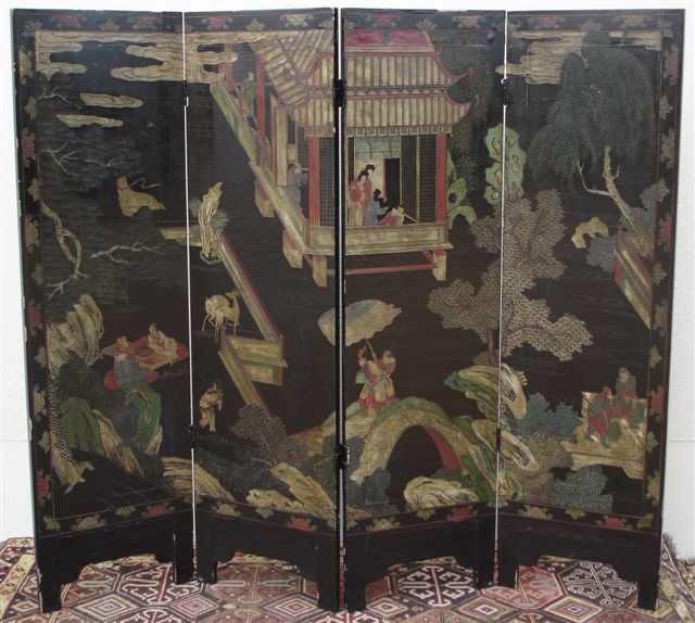 PARAVENT en laque de Coromandel de quatre feuilles, décoré sur une face avec des personnages dans un palais et des biches dans un jardin.