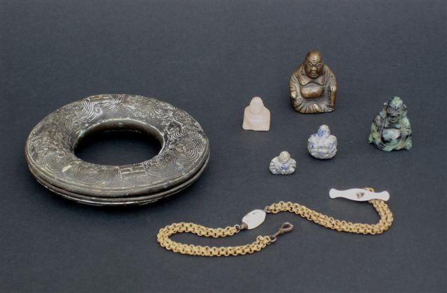 Anneau en bronze, 5 Poussah dont un en bronze, un en quartz rose, deux en lapis-lazuli, un en zoïzite et une chaîne en vannerie et ivoire gravé.
