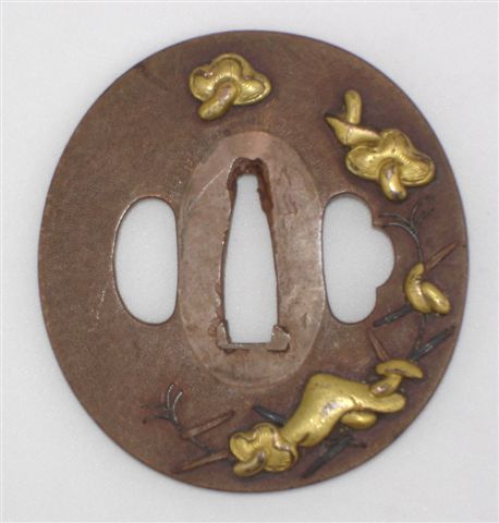 NAGA-MARU-GATA en suaka, décorée de champignons en taka-zôgan de cuivre jaune.