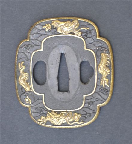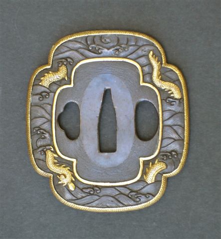 MOKKO-GATA en shibuichi, surface partiellement traitée en nanako-ji, gravée et décorée en taka-zôgan de cuivre de deux dragons parmi les flots.