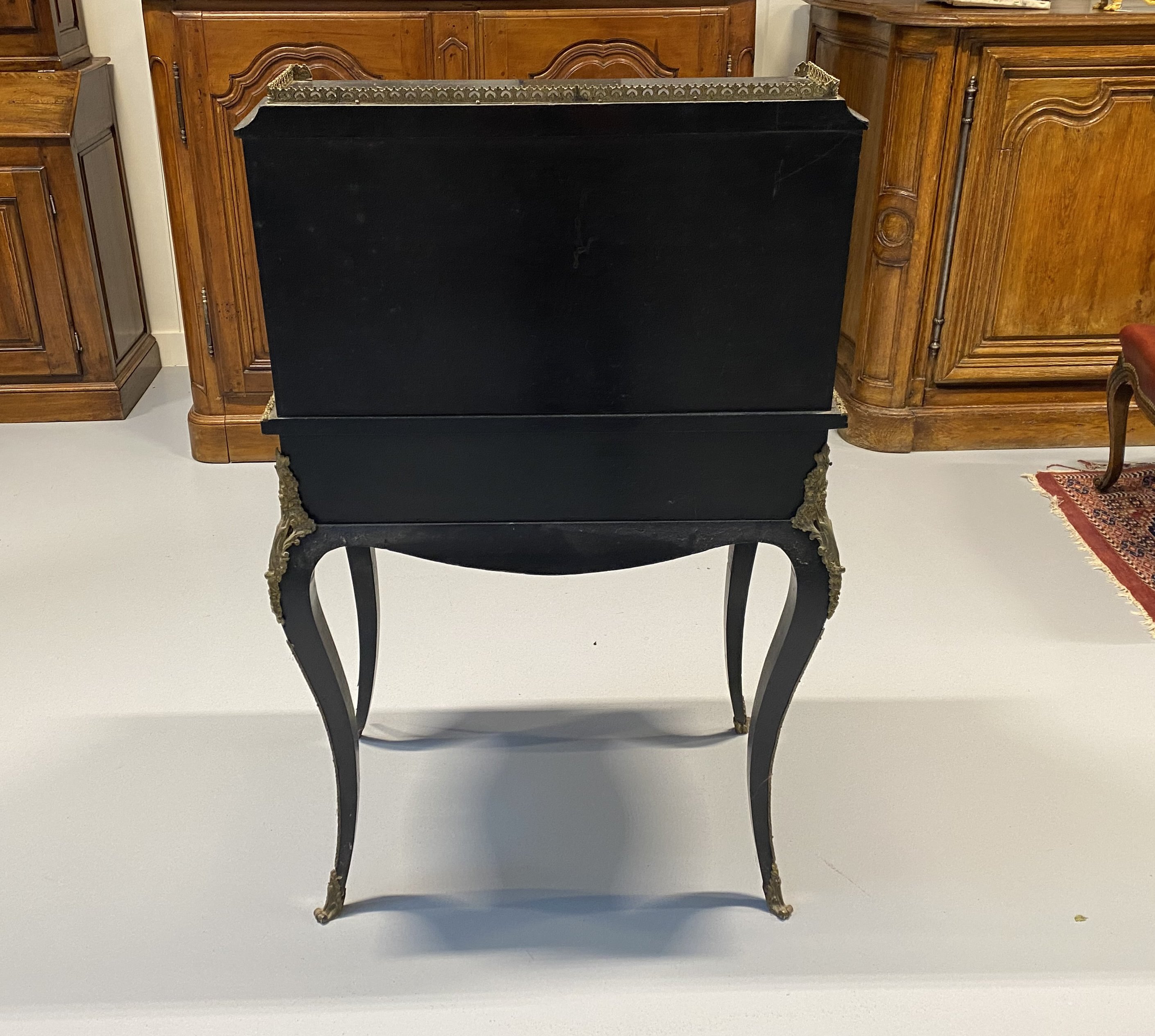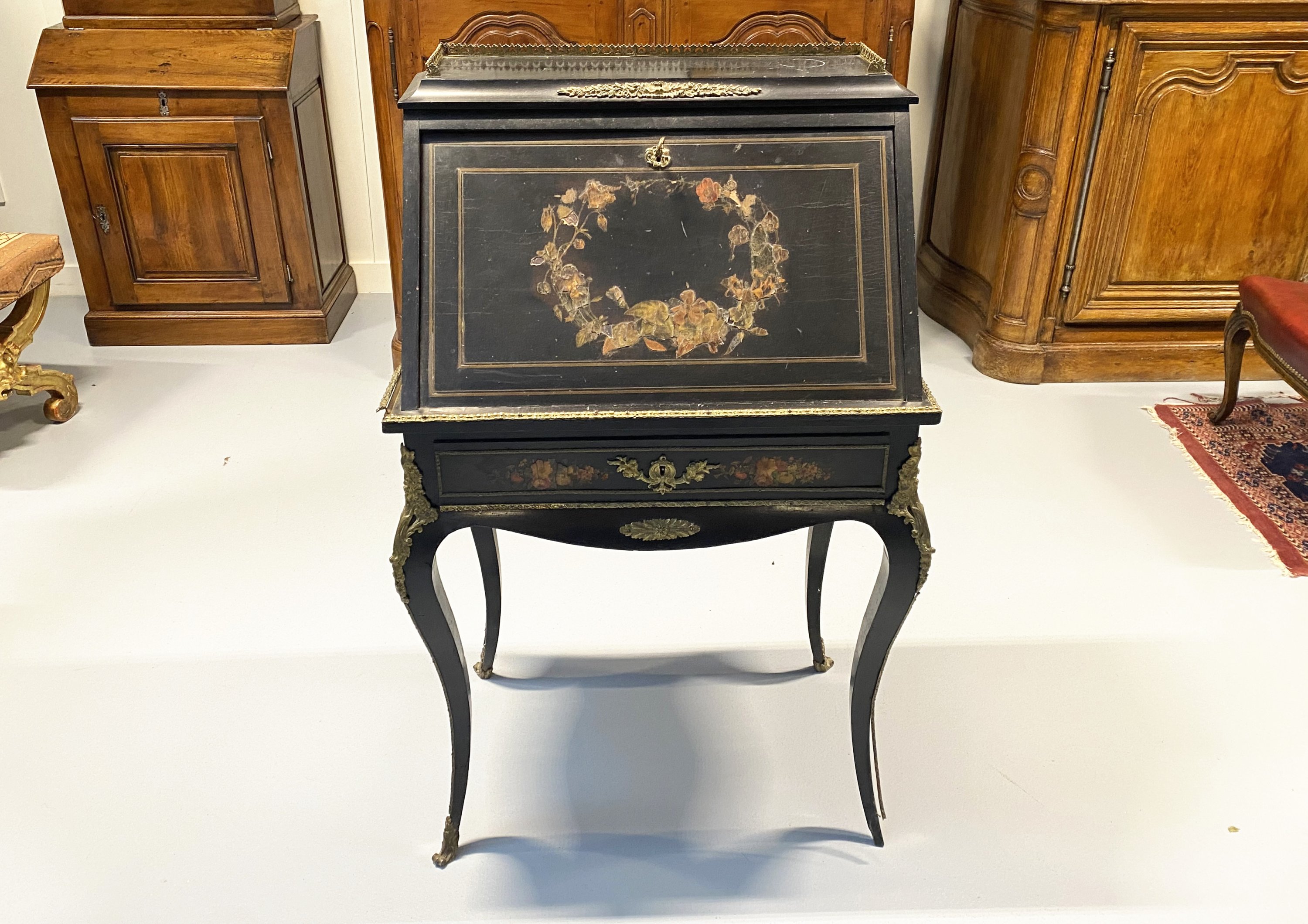 Il ouvre par un abattant à décor laqué d'une couronne florale découvrant deux tiroirs et une étagère. La ceinture ouvre par un tiroir en ceinture. Quatre pieds cambrés.