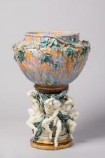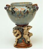 Contre toute attente, c’est non pas à la Manufacture de Sèvres, mais à celle de Choisy-le-Roi que le modèle trouve sa forme finale, avec une vasque sublimée par les couleurs chatoyantes de l’émail. Cette faïencerie locale connait un véritable succès lors de sa prise en main par Hippolyte Boulenger en 1863. En introduisant un procédé importé d’Angleterre qui imite la porcelaine de Chine et en renouvelant les créations de la manufacture, le nouveau directeur permet aux faïences de Choisy-le-Roi d’être reconnues au niveau international. Le choix de faire éditer la Jardinière des Titans dans cette entreprise spécialisée en faïencerie, ainsi que de nombreux autres modèles de Carrier-Belleuse, s’explique par la nomination de son propre fils Louis-Robert (1848-1913) comme directeur artistique de 1890 à 1895. Intéressé très tôt par les arts industriels, Louis-Robert a en effet travaillé auprès de son père à la manufacture de Sèvres, avant de bénéficier d’une formation par le célèbre céramiste Théodore Deck. Fournisseur également de nombreux modèles et directeur de la politique de production de la manufacture, il fait exécuter des œuvres qui sont parfois signées des initiales de son père, mort en 1887, et de lui-même en signe de leur intime collaboration.