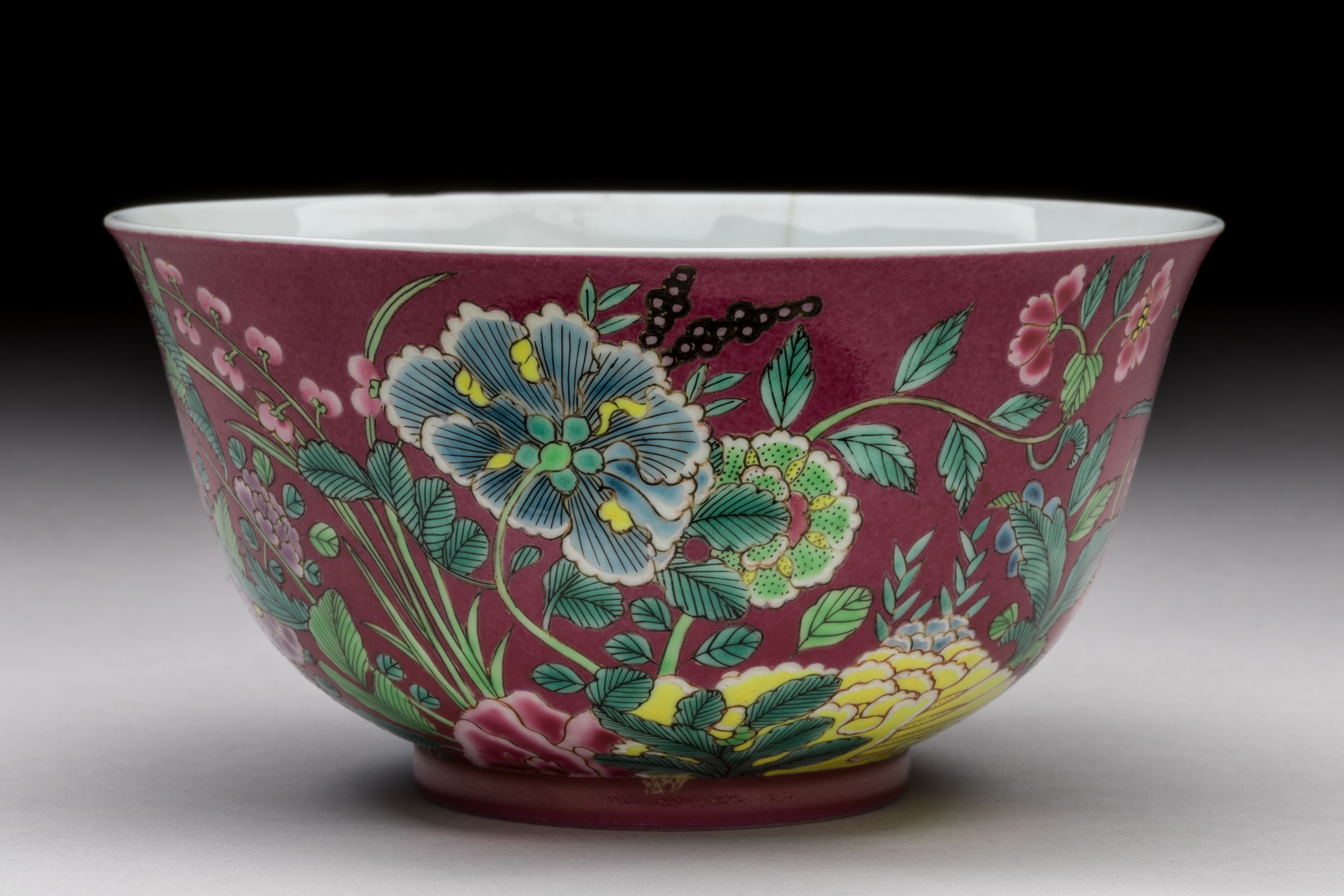 - Chine, époque Yongzheng (1723-1735), bol en porcelaine émaillé et polychrome de la famille rose à décor de pivoines dans un feuillage sur fond rubis, marque de Yongzheng à six caractères en kaishu, diam. 12,2 cm. Adjugé : 86 000 €