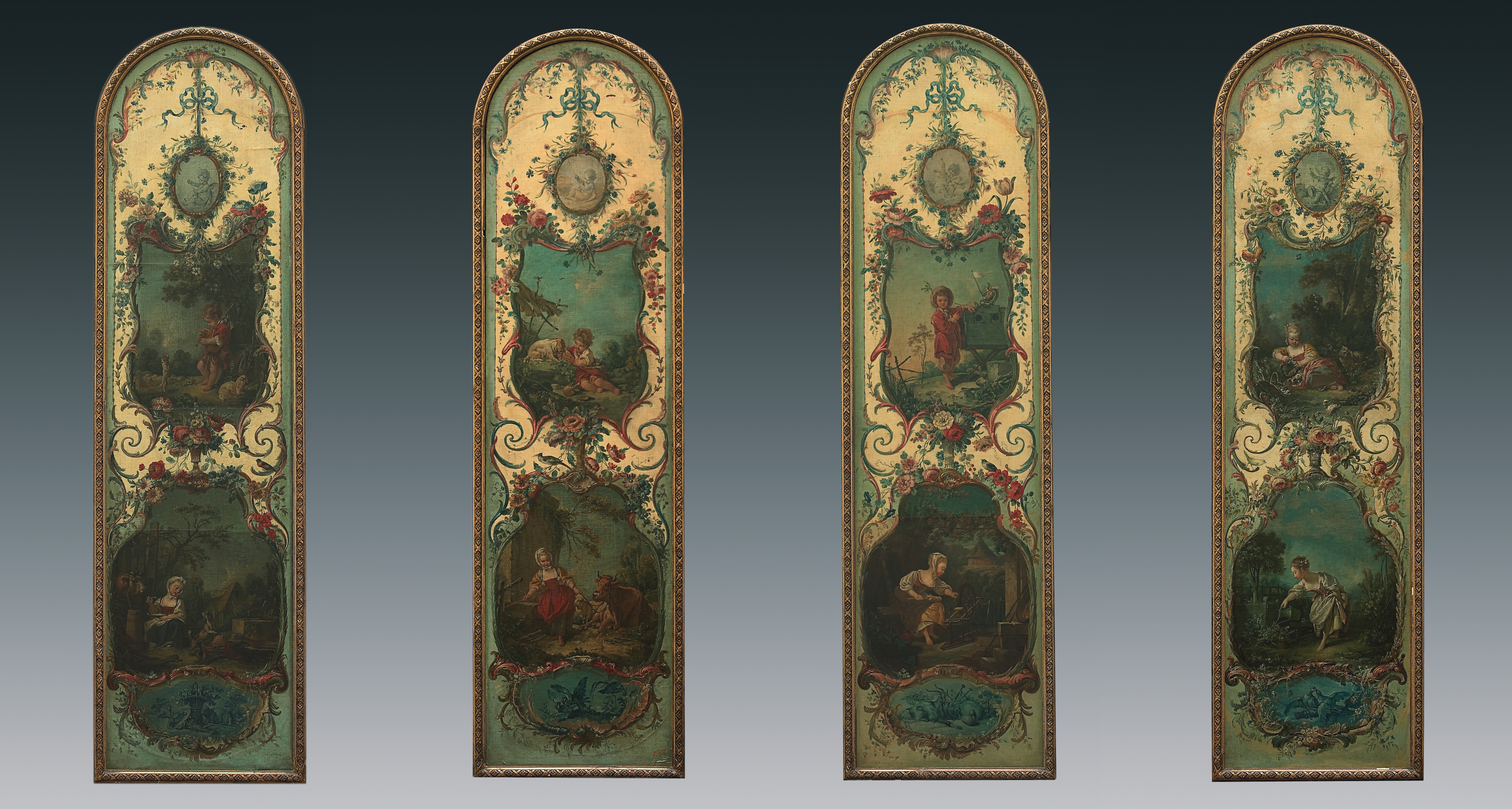 - François Boucher (1703-1770), scènes pastorales dans des encadrements rocaille, quatre toiles cintrées en partie supérieure, 274 x 70 cm. Adjugé : 496 000 €