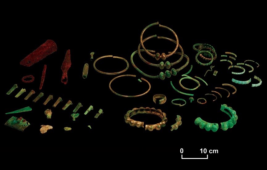 Considérant que les biens pour lesquels le certificat est demandé constituent un rare ensemble de pièces archéologiques découvertes en 2012, apparemment rassemblées volontairement et empilées avec soin dans une fosse peu profonde, sur le site des Pièces de la Cave à Tavers (Loiret) ; qu'il date probablement du courant du VIe siècle avant J.-C., période correspondant au premier âge du Fer ou au Hallstatt moyen selon le système chronologique utilisé ; que ce singulier dépôt métallique composé de 65 objets ou fragments d'éléments de parure, d'armes et de pièces d'outillage en bronze et fer, s'avère, par la diversité des pièces qu'il comprend et des matériaux utilisés, et par son homogénéité chronologique, d'un important intérêt scientifique et patrimonial ; qu'il comporte majoritairement des objets en alliage cuivreux, comme une fusée de poignard à antennes et des éléments d'ornement corporel, entiers ou fragmentaires, essentiellement des parures annulaires ; qu'il intègre aussi une série homogène de haches à douille quadrangulaire, miniatures et donc non fonctionnelles , proches d'exemplaires découverts dans le Massif am1oricain, qui sont, pour la première fois, associées à un dépôt contenant plusieurs autres catégories d'objets, offrant ainsi un contexte précis pour les dater ; que, par ailleurs, cet ensemble recèle quelques obj ets en fer, notamment une lame de hache à douille, massive par son poids, à la facture de qualité, dont on trouve quelques équivalents à la fin du Hallstatt moyen, notamment dans la tombe à char de Hochdorf en Bade-Wurtemberg ; qu'en outre, l'importance de cet ensemble, demeuré en très bon état de conservation, résulte de son origine orléanaise, région qui n 'a pas encore livré de dépôts significatifs pour la période considérée, mais aussi, alors qu 'aucune sépulture privilégiée ou habitat n 'a encore été identifié localement à cette époque, de ce qu'il témoigne de l 'existence d'une classe sociale de haut rang à cet endroit ; que cette association inédite d'objets, se situant à la croisée de différentes types de dépôts du VIe siècle avant J.-C., du Centre-Ouest à l a Franche-Comté, avec également des caractères annoricains ; doit être préservée de la dispersion et a vocation à rejoindre les collections publ iques en tant que précieux jalon complétant la connaissance du Premier âge du Fer en France ; qu'il suit de là que cet ensemble de biens présente un intérêt majeur pour te patrimoine national du point de vue de l'histoire et de l'ai1et revêt ainsi le caractère de trésor national.- La vue photographique générale a été prise par Sarah de Grandis, Université de Toulouse, de l'équipe TRACES.