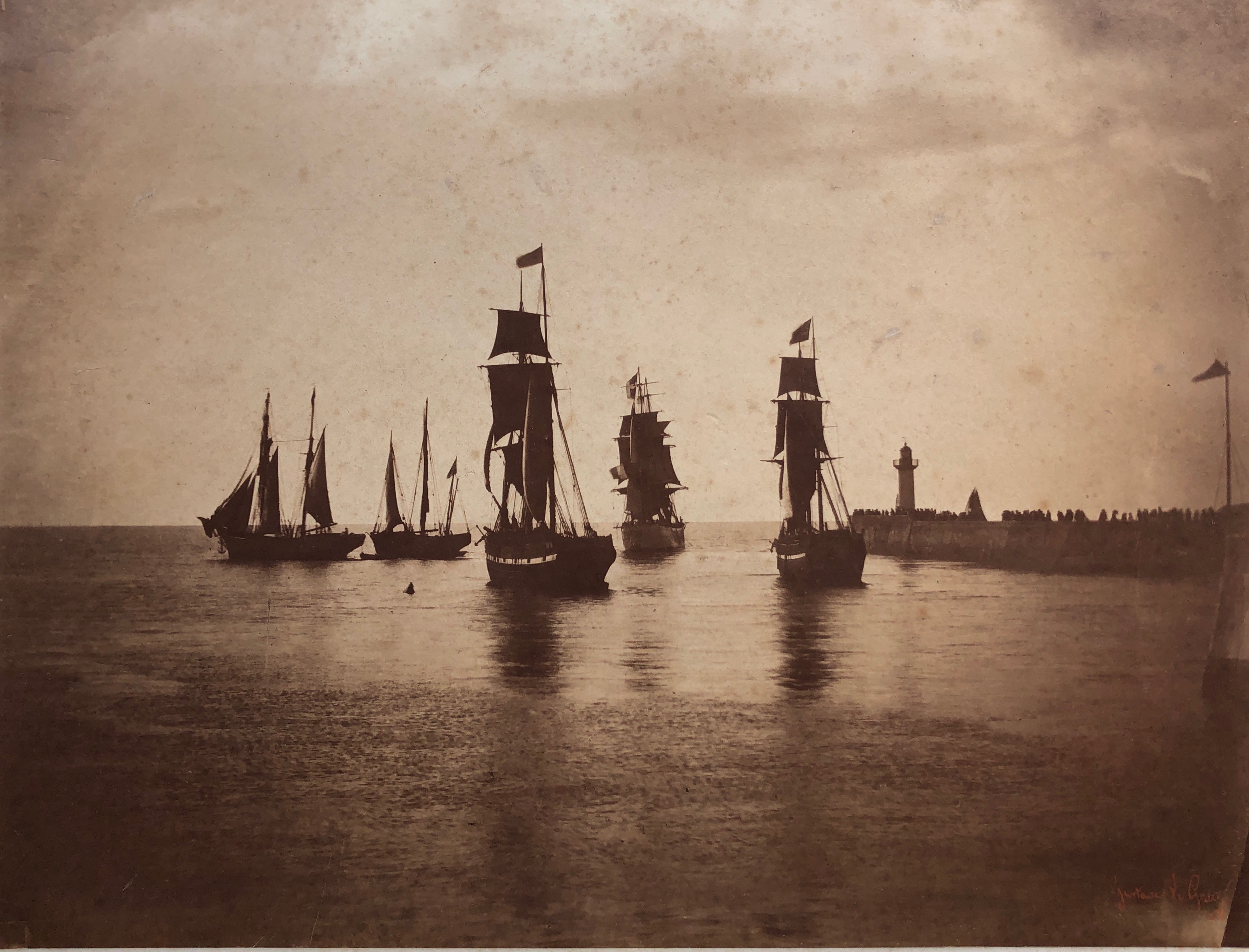 165 ans après sa création, ce chef-d’œuvre magistral de l’art photographique aux douces et riches tonalités homogènes dues au virage à l’or, exerce une irrésistible fascination. La composition singulière, le contre-jour qui dessine les contours des bateaux de commerce et les silhouettes des personnages qui se pressent sur la jeté du Havre lui confèrent une atmosphère à la fois mystérieuse et étonnamment contemporaine. Les bandes blanches, peintent le long des coques simulent l’emplacement de canons fictifs, sont destinées à éloigner les pirates en leurs faisant croire qu’il s’agit de navires armés. Cette illusion perdurera jusqu’à nos jours, comme en témoignent les titres en référence à la flotte de Napoléon III des épreuves conservées dans de prestigieuse collections (voir Littérature ci-dessous).