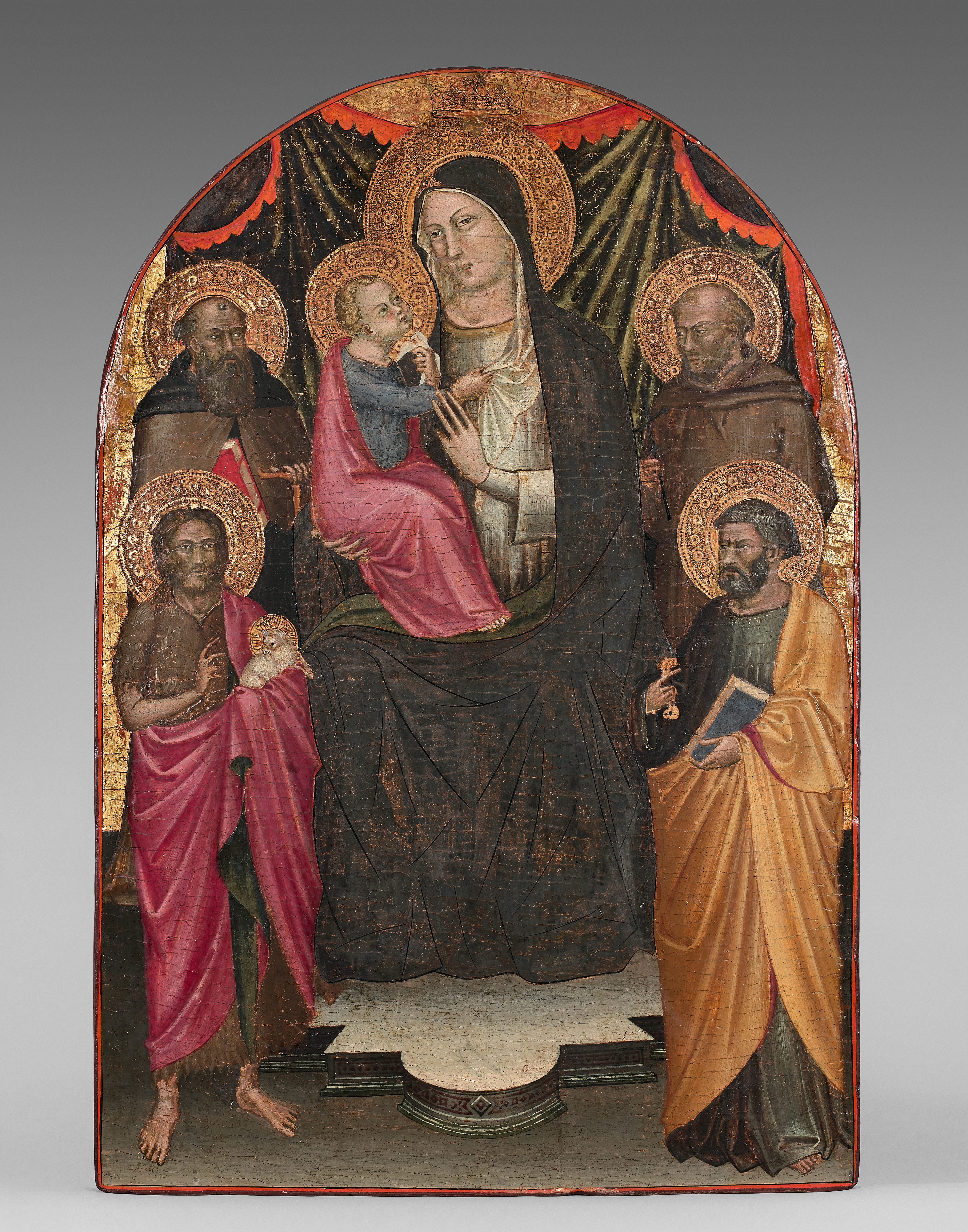 L’œuvre est une Vierge à l’Enfant en trône entourée par quatre saints, une typologie qui dérive de la représentation la plus traditionnelle de l’Italie médiévale, celle de la Vierge tenant dans ses bras le Christ enfant. Jacopo di Cione l’a représentée plus d’une dizaine de fois.