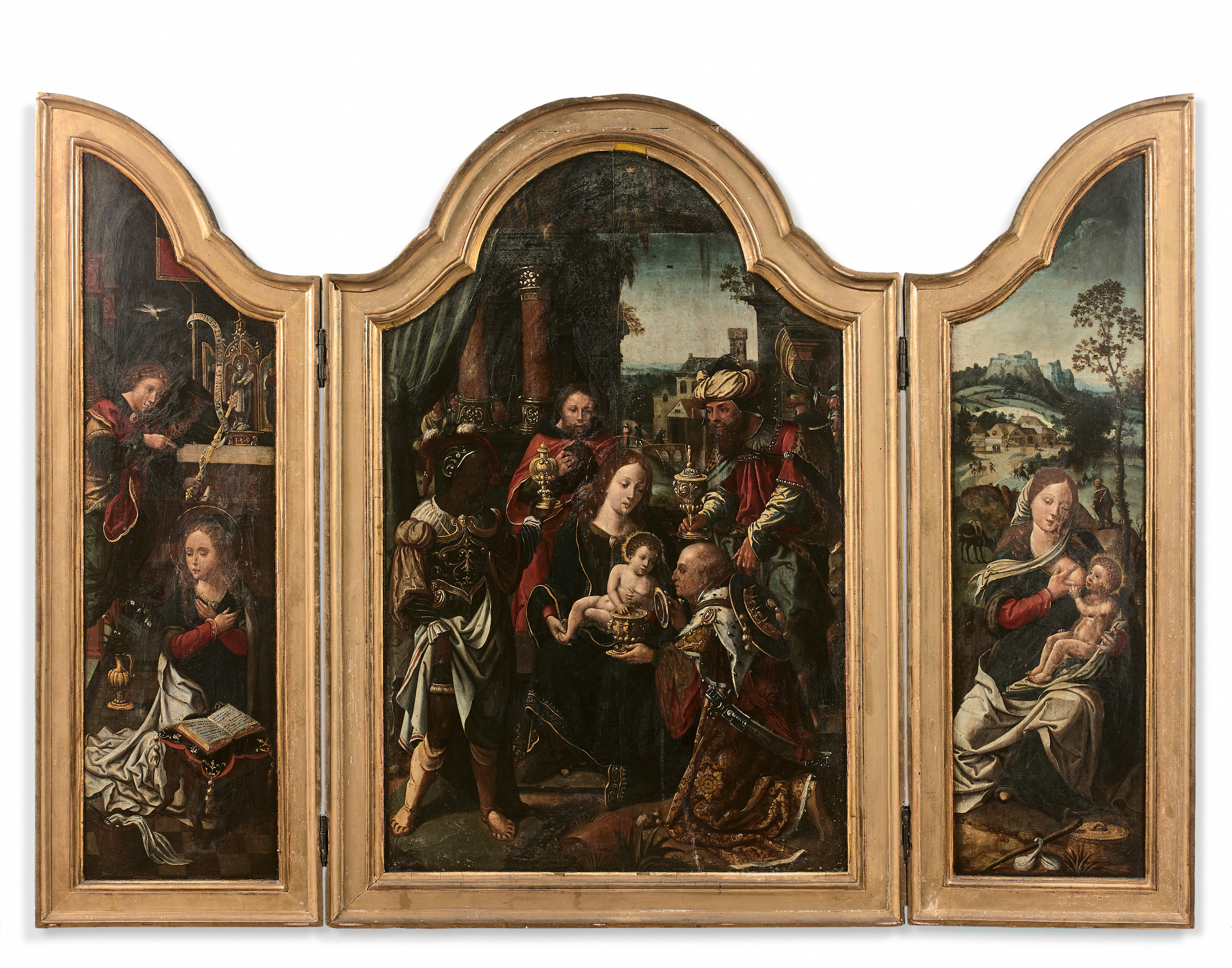 Pieter Coeck et son atelier ont réalisé un certain nombre de triptyques pour la dévotion privée. Dans celui-ci, l'alternance des trois mêmes scènes évangéliques est similaire à deux autres conservés au Palazzo Bianco à Gênes (Georges Marlier, La Renaissance flamande, Pierre Coeck d'Alost, 1966, p.122, fig.46, 93 x 109 cm) et à l'Université de Princeton (Marlier, op.cit., p.125, fig.49, 99.5 × 137.5 cm) avec à chaque fois quelques variantes. Dans le panneau de gauche, l'Annonciation, le visage de la Vierge est tourné différemment vers la gauche. Les détails du paysage de la Fuite en Egypte varient aussi à chaque fois, et la composition centrale de notre œuvre intervertie la place de chaque roi mage par rapport aux deux autres triptyques cités.