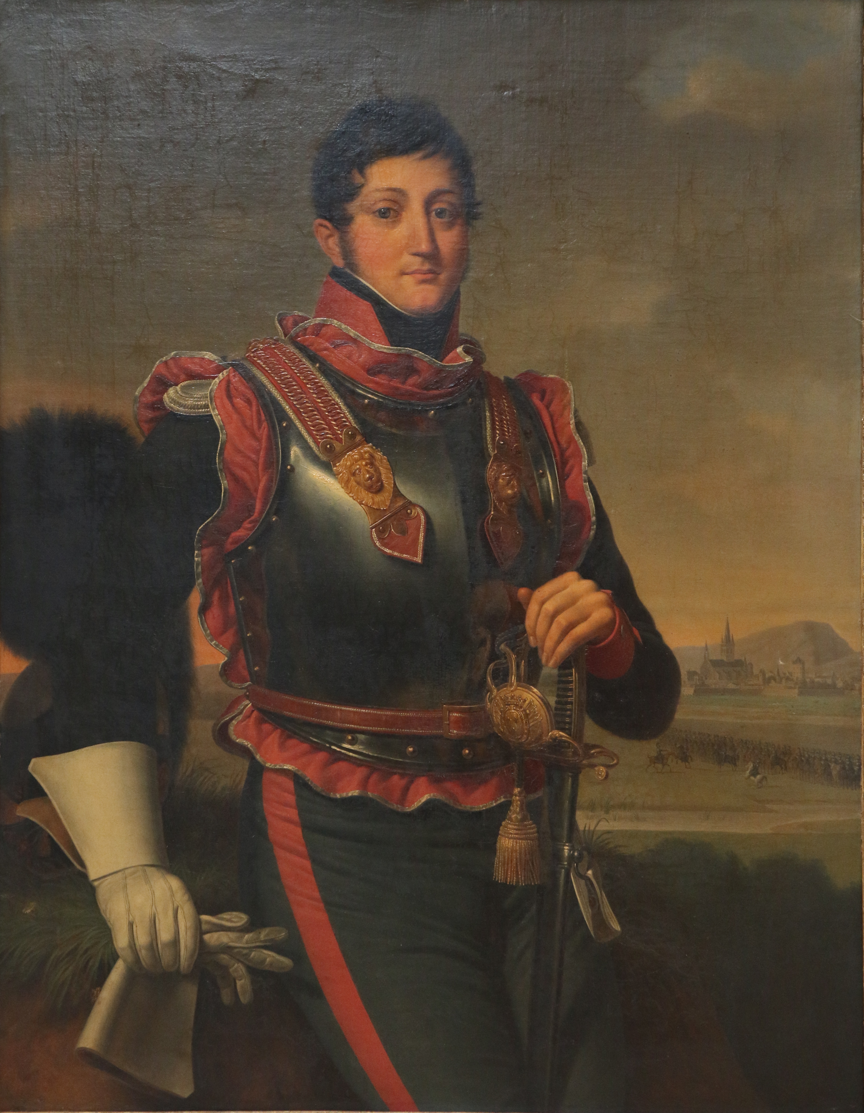 Lagrenée peint ici un jeune cuirassier de la Restauration devant un paysage au fond duquel une troupe s'exerce. C'est un officier, lieutenant en premier, à épaulette et contre épaulette en passementerie d'argent. Son casque à chenille et jugulaires dorées confirme son grade, tout comme les agrafes d'épaulières en mufle de lion doré ainsi que les doublures d'épaulière et la ceinture en maroquin brodé.