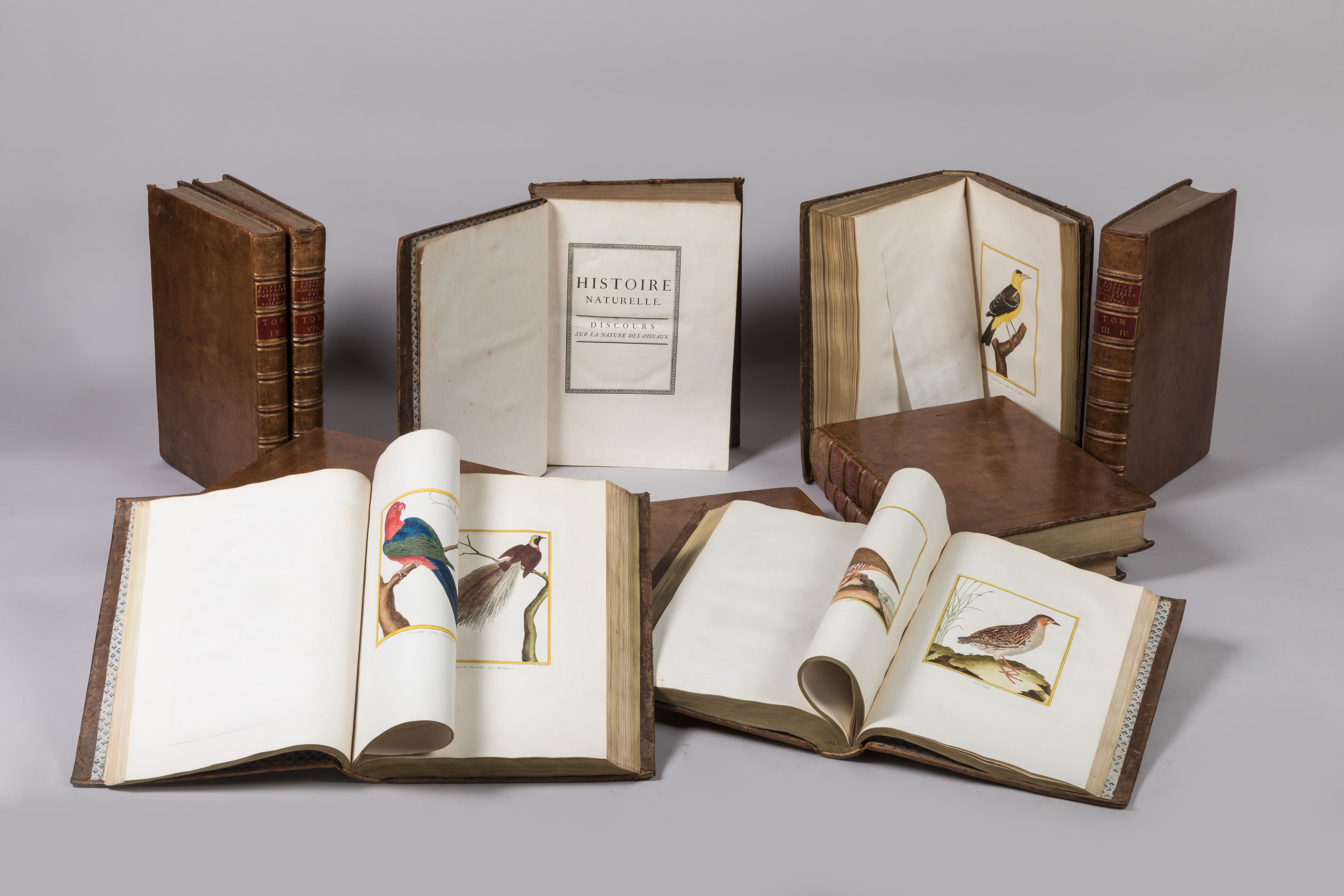 Neuf tomes (sur dix : le tome X manque) en sept volumes grand in-folio (450 x 332 mm). Plein veau fauve. Pièces de titre et de tomaison de veau cerise. Gardes de papier dominoté. Reliure du temps. Exempts de rousseurs.