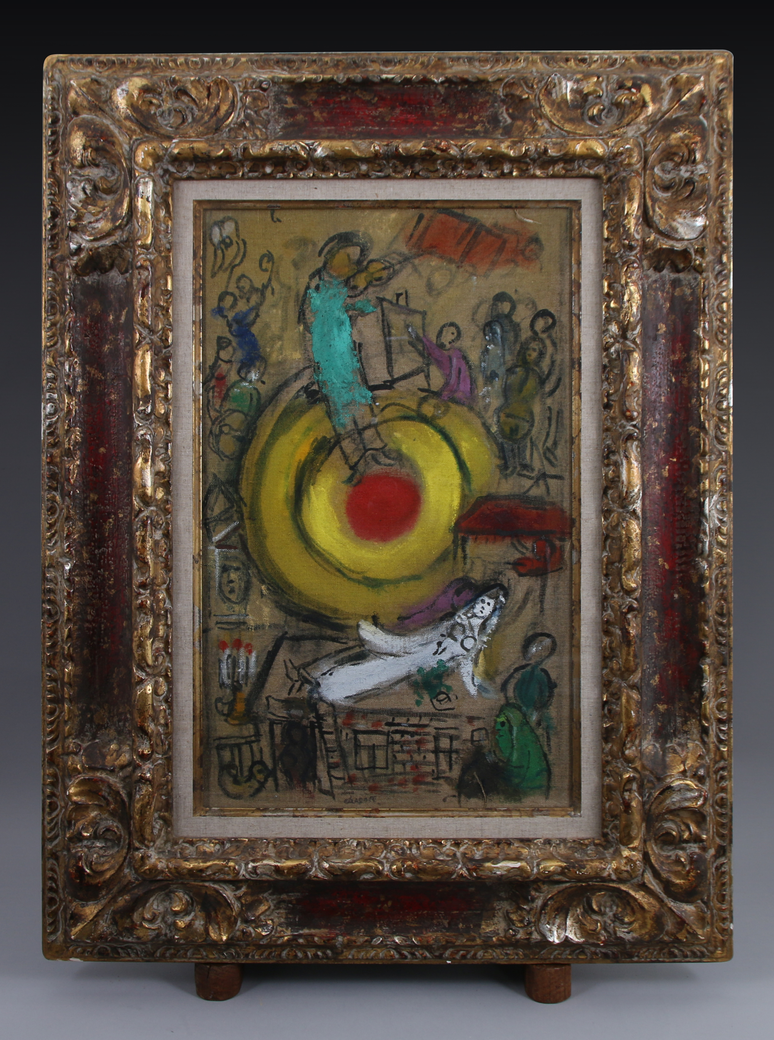 La toile Libération a été peinte par Marc Chagall en 1952, d’après celle aujourd’hui conservée au musée Chagall à Nice. Sa manière fluide, à grands coups de brosse, dénote l’influence reçue de la jeune peinture américaine lors de son exil aux États-Unis pendant la guerre. Le peintre s’y représente au bras de son épouse Bella, en tenue de mariée, volant au-dessus de trois cercles rouge et jaune vif au rythme rapide d’un air de violon (est. 280/320.000 euros).
