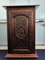 Votre confiturier est en bois naturel, du chêne teinté. Il mesure très probablement 120 centimètres de hauteur par 60 de profondeur. Il présente un riche décor sculpté. L’abattant est ceint d’une frise feuillagée, tandis que le ventail articule un décor autour d’un médaillon central : frise de perles, bouquets, rinceaux, dauphins et profil d’une mystérieuse jeune femme. L’ensemble repose sur un soubassement à doucine.