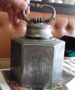 Votre objet, Pierre, est une sorte de petite carafe hexagonale, avec un bouchon à vis. Chaque face semble être décorée d’un Saint, ce qui pourrait être un indice quant à ses origines religieuses. Vous nous disiez dans votre courriel que vous pensiez qu’il s’agissait d’une gourde de pèlerin. C’est tout à fait possible, des objets semblables ayant été produits pour conserver l’eau, voire le vin des marcheurs qui autrefois traversaient l’Europe à pied pour se rendre sur le tombeau des Saints, tel celui Saint Jacques. Près des lieux saints de par le monde se situe généralement une fontaine, une source dont on puise et rapporte de l’eau dans une gourde, tel ce récipient à décor religieux. Songeons à l’eau de Lourdes…