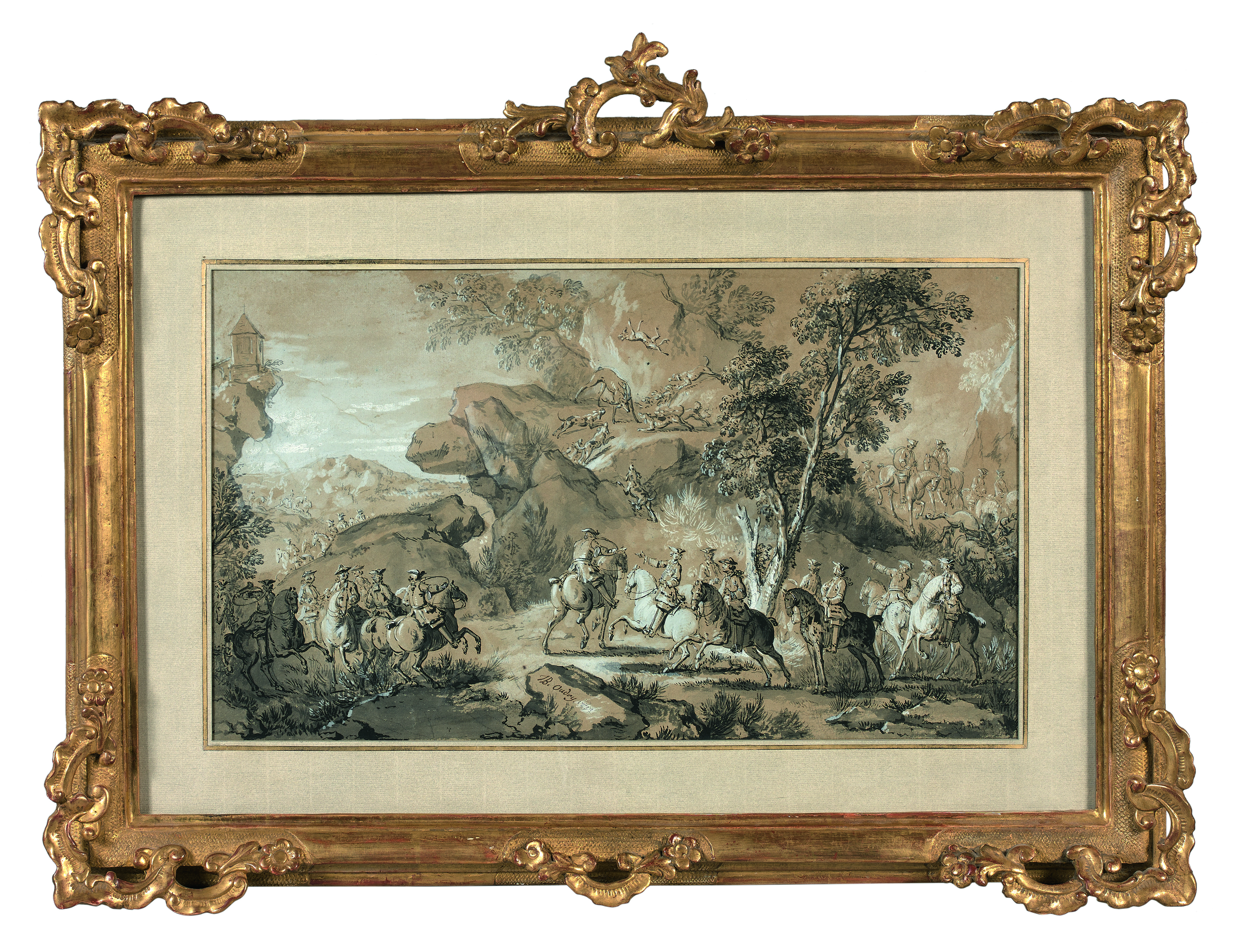 Ces dessins préparent les tentures des Chasses Royales de Louis XV : ensemble de neuf tapisseries conçues par Jean-Baptiste Oudry dans les années 1733-1738. Les tapisseries, tissées aux Gobelins, devaient orner la chambre du roi, son antichambre et le cabinet du conseil au château de Compiègne. Notre dessin fait partie du même groupe que "Louis XV chassant le Loup" conservé au Musée du Louvre (1728, 38 x 52 cm, Inv. 31493) et que "Louis XV tenant en laisse un limier" (1728, 33 x55 cm, vente Couturiers Nicolaÿ, expert de Bayser, Paris 17 mars 1989).