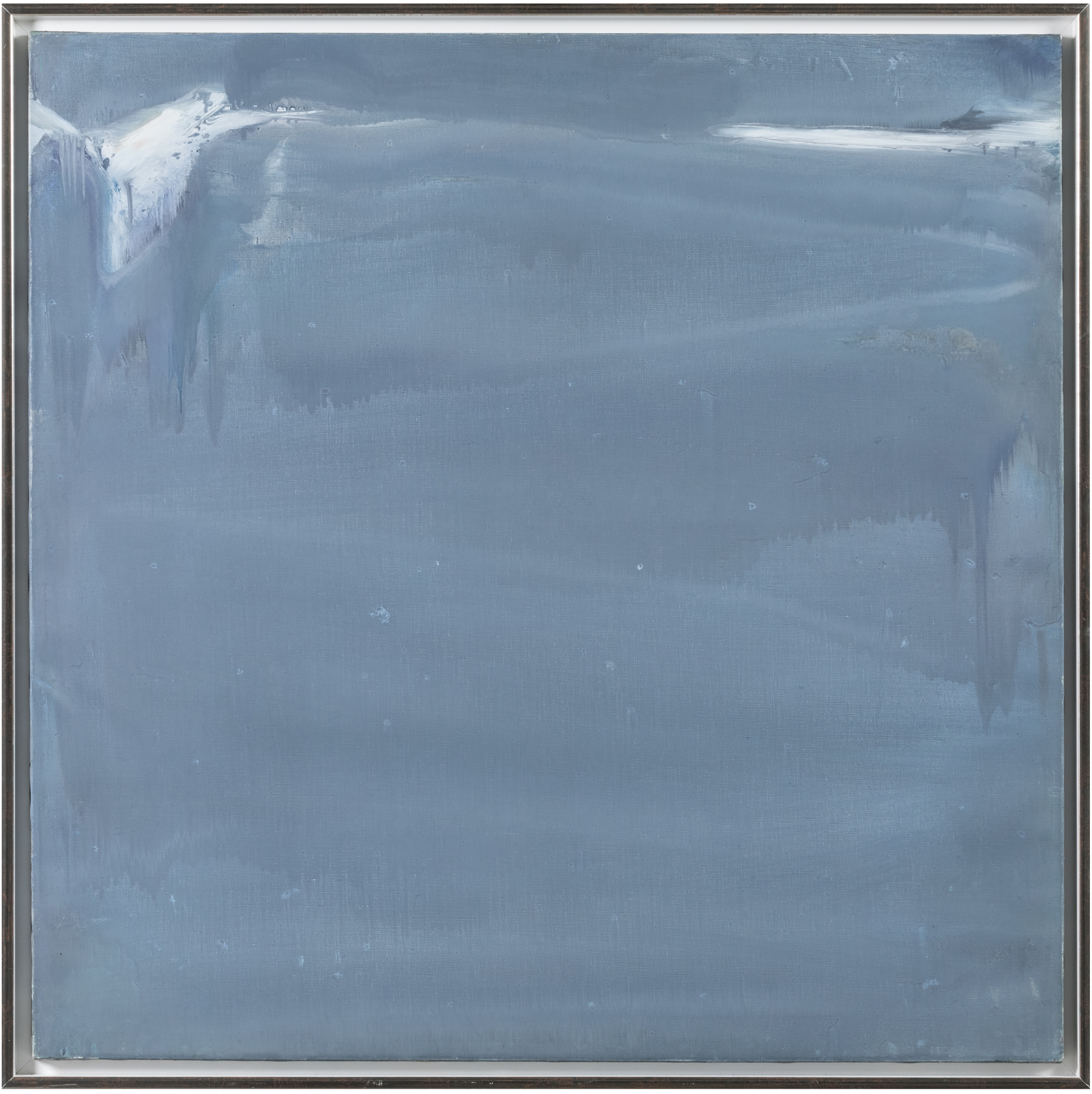« Je pars, j’avance, et je me dis je vais peindre là » confie Olivier Debré. Le monde offre à l’artiste un immense atelier à ciel ouvert. La Norvège est l’un de ses terrains favoris, qu’il explore entre 1966 et 1998. Là-bas, il commence à peindre en 1971 dans un vocabulaire esthétique, où le signe n’a plus sa place. Notre toile est réalisée en 1979. Lors de ce voyage, Debré est accueilli par l’armateur H.R. Astrup à Laerdal, qui lui ouvre les portes de « Lysne », sa propriété. Des jours durant, l’artiste peint sur le motif, jouant des nuances d’un bleu gris et des subtilités de la matière que lui évoque le Sognefjord. Épaisse à l’extrémité supérieure, l’huile est d’une pureté infinie dans le reste de la surface, seulement perturbée par des coulures volontairement apposées.