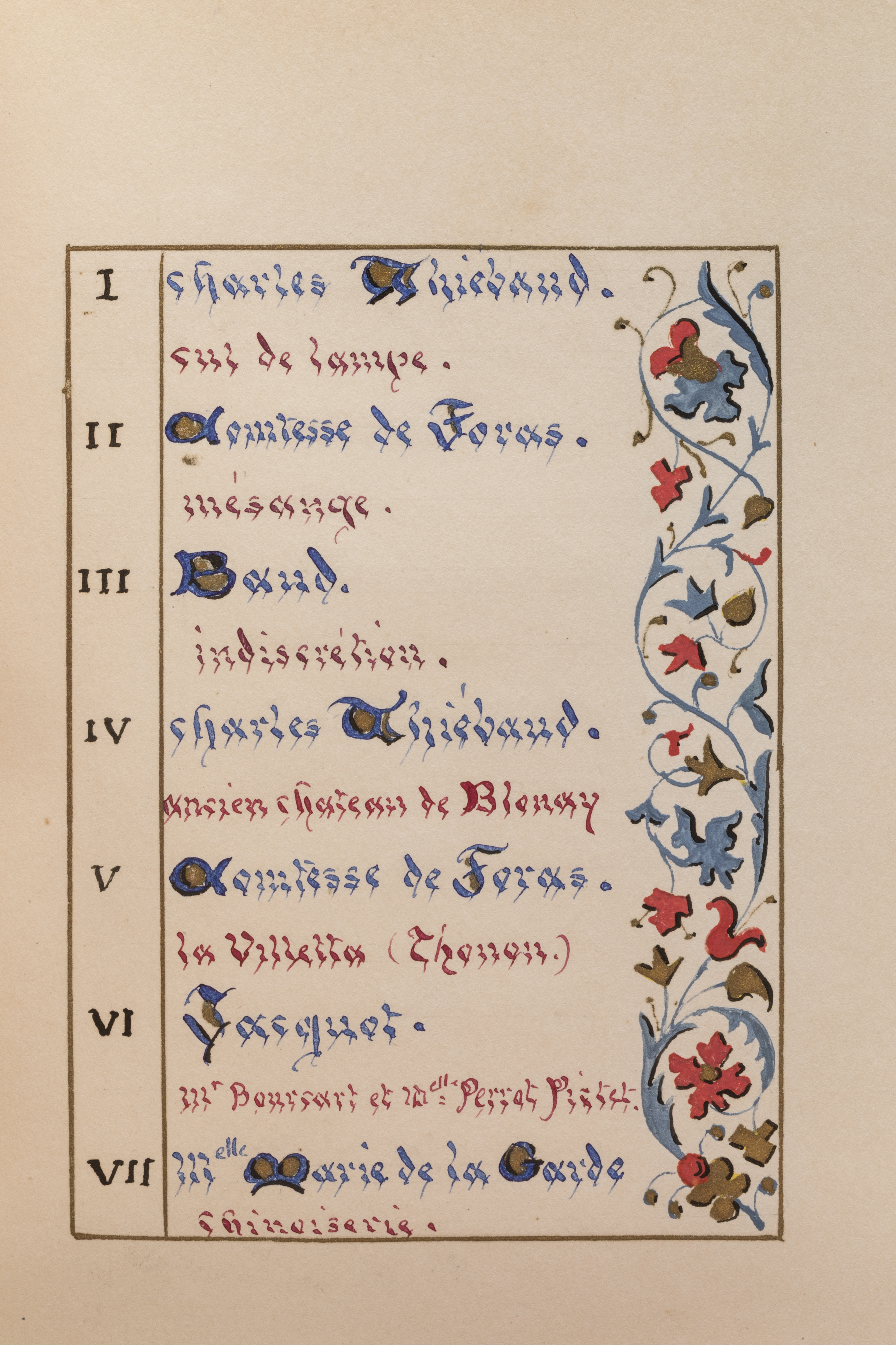 Le manuscrit, soigneusement calligraphié en lettres gothiques cursives, est très abondamment illustré. Les artistes contributeurs sont tous nommés. Ce sont vraisemblablement, pour la plupart, des proches du Baron Bouvier d'Yvoire, partageant ses idées politiques "catholiques libérales" (Alfred Dumont), des membres de familles alliées de diverses provinces (Rozat de Mandres), des notables de la Haute Savoie et de la région du Lac Léman (Maurice Bourcart, médecin et membre du Cercle des Artistes de Genève). A remarquer aussi le nom de Charles Cottet (peut-être le grand peintre Charles Cottet, 1863-1925, issu d'une famille savoyarde). Près d'un tiers des illustrations est réalisé par des femmes : Augustine Bouvier, Gabrielle et Suzanne Thiébaud, la comtesse de Faras, la comtesse de La Bédoyère, Joséphine Braendlin, la baronne de Villette et quelques autres.