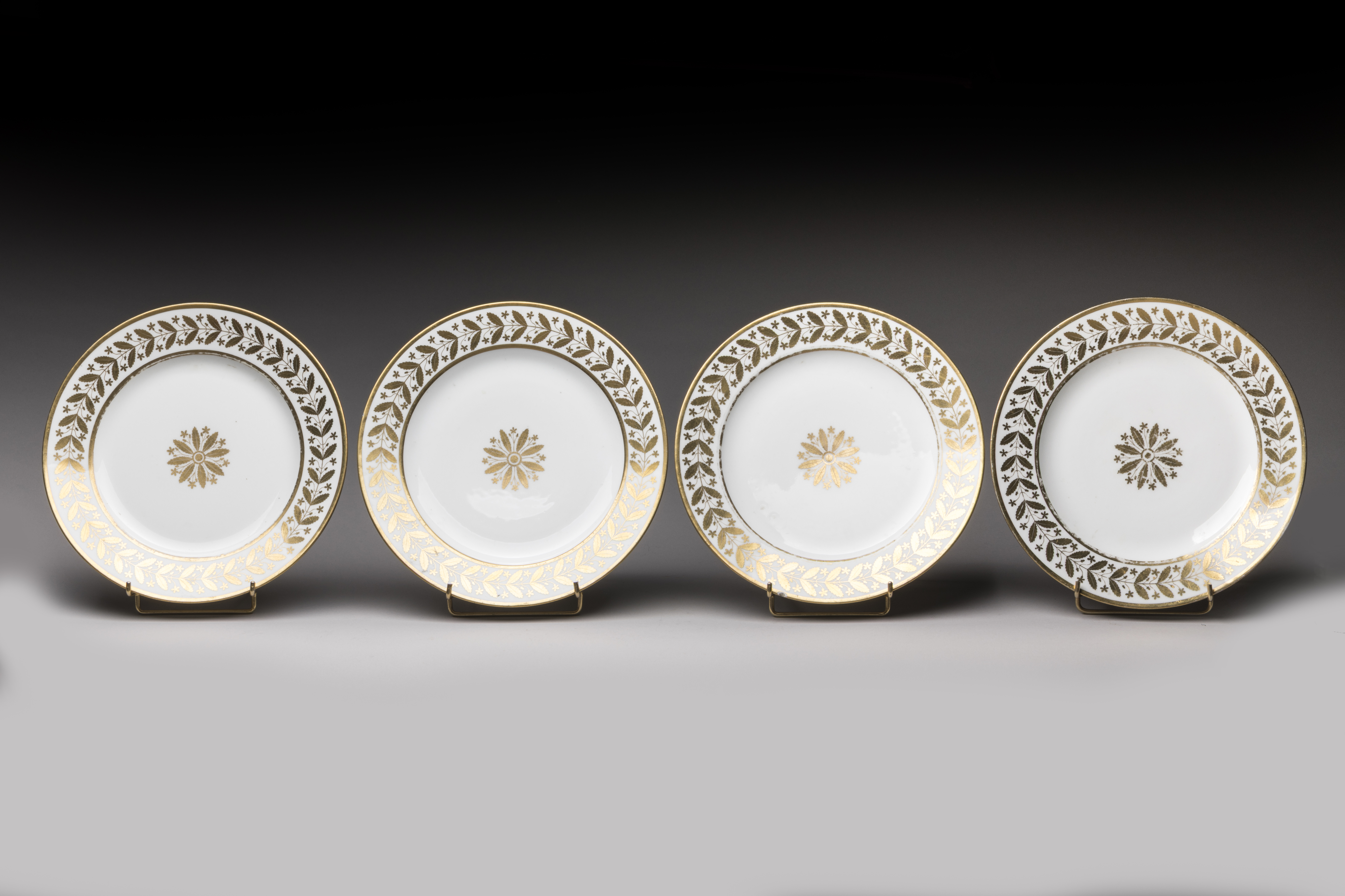 The Imperial Manufacture in Sèvres. An 1808 set of four plates for Emperor Napoleon I's personal service in Rambouillet. Empire Period.