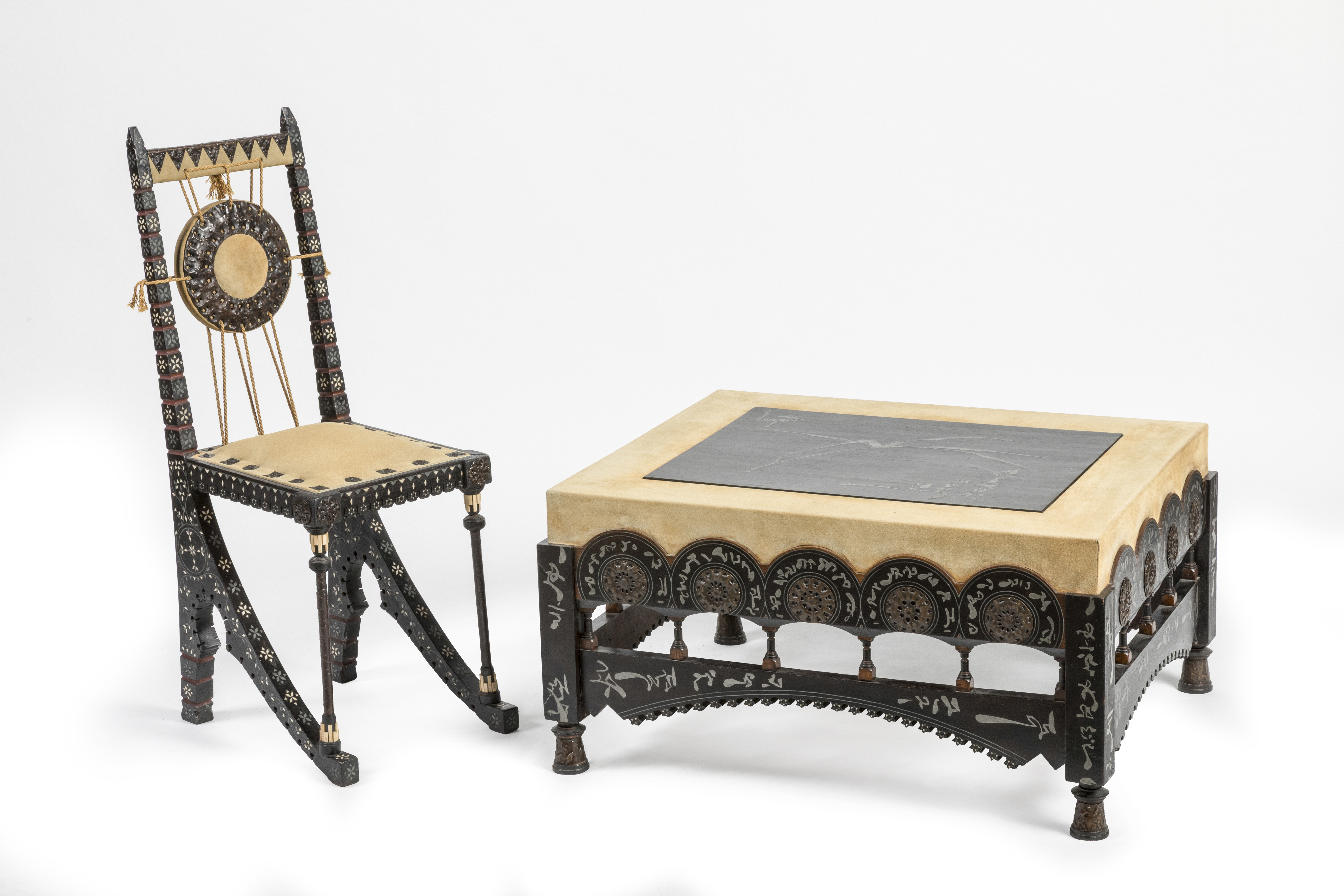 Carlo Bugatti se distingue par la richesse de ses créations, dont l'inspiration lui vient notamment de l'observation de l'artisanat islamique, s'inscrivant en cela dans le mouvement de l'orientalisme et la lignée de l'Aesthetic movement anglais. Empruntant au vocabulaire ornemental du Proche-Orient ses fines colonnettes en cuivre et ses incrustations de nacre sur fond de bois sombre, il développe dès les années 1880 une gamme de mobilier particulièrement originale.