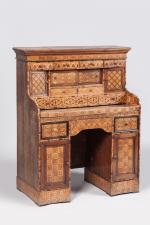 à riche décor de figures géométriques et motifs floraux stylisés. Le gradin, coiffé d'une corniche moulurée, ouvre en façade par neuf tiroirs, deux vantaux et deux portes coulissantes. Il surplombe un plan de travail coulissant. La partie inférieure comporte deux tiroirs et deux caissons avant reposant chacun sur une plinthe amovible. Boutons de tirage en bois tourné. Une plinthe signée.