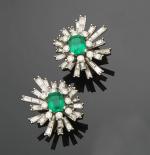 Paire de BOUCLES d’OREILLES en platine 850 millièmes et or gris 375 millièmes, à décor rayonnant, le centre orné d’une ÉMERAUDE rectangulaire à pans coupés - de près de 3 carats chacune - entre des DIAMANTS ronds et baguettes.