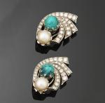 Paire de BOUCLES d’OREILLES en platine 850 millièmes et or gris 750 millièmes (pour les raquettes et talons), à décor d’enroulement, chacune ornée au centre d’une PERLE de culture et d'une boule de TURQUOISE MATRIX entre des lignes de DIAMANTS ronds de tailles diverses.